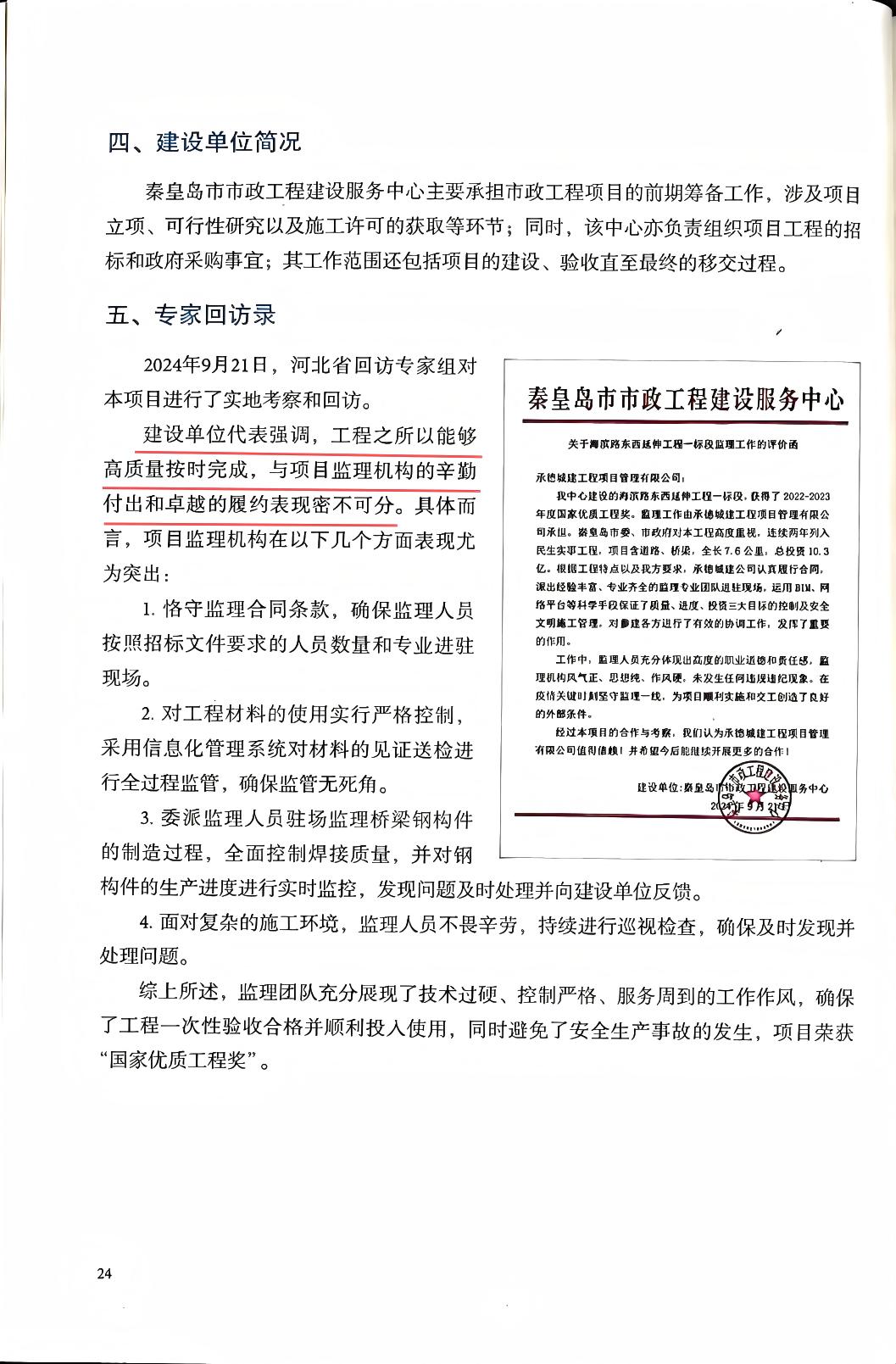 在本次入選《工程監(jiān)理業(yè)主滿意項(xiàng)目》百強(qiáng)名單的秦皇島海濱路東西延伸工程一標(biāo)段項(xiàng)目中,承德城建展現(xiàn)了精益求精的專業(yè)實(shí)力和恪盡職守的擔(dān)當(dāng)精神。作為秦皇島市的重點(diǎn)工程,該項(xiàng)目涵蓋道路、橋梁、排水、路燈及綠化等交通配套設(shè)施,采用混凝土箱梁橋、等截面及變截面鋼箱梁橋型式,結(jié)構(gòu)復(fù)雜,監(jiān)理難度大。承德城建選派優(yōu)秀總監(jiān)及各專業(yè)監(jiān)理人員組成強(qiáng)有力的項(xiàng)目監(jiān)理機(jī)構(gòu),并組建專家顧問團(tuán)隊(duì)為項(xiàng)目提供全方位的管理與技術(shù)支持。
